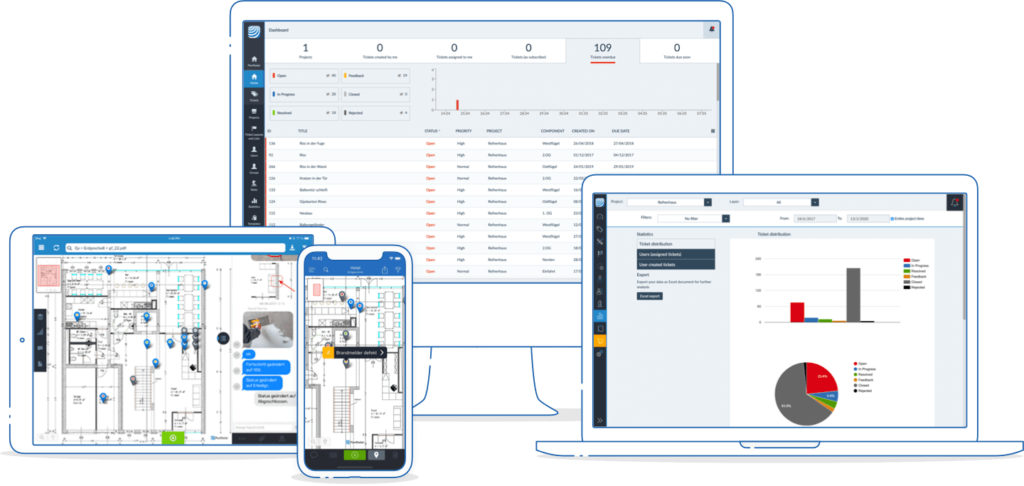 Zarządcy i właściciele obiektów mogą na bieżąco śledzić rozwój sytuacji. Zespół projektowy może realizować zaplanowane zadania za pomocą PlanRadar i tworzyć raporty jednym przyciskiem. Oznacza to, że wszystkie potrzebne informacje zawarte są w jednej aplikacji i zawsze masz pełny podgląd placu budowy. PlanRadar pracuje w czasie rzeczywistym.